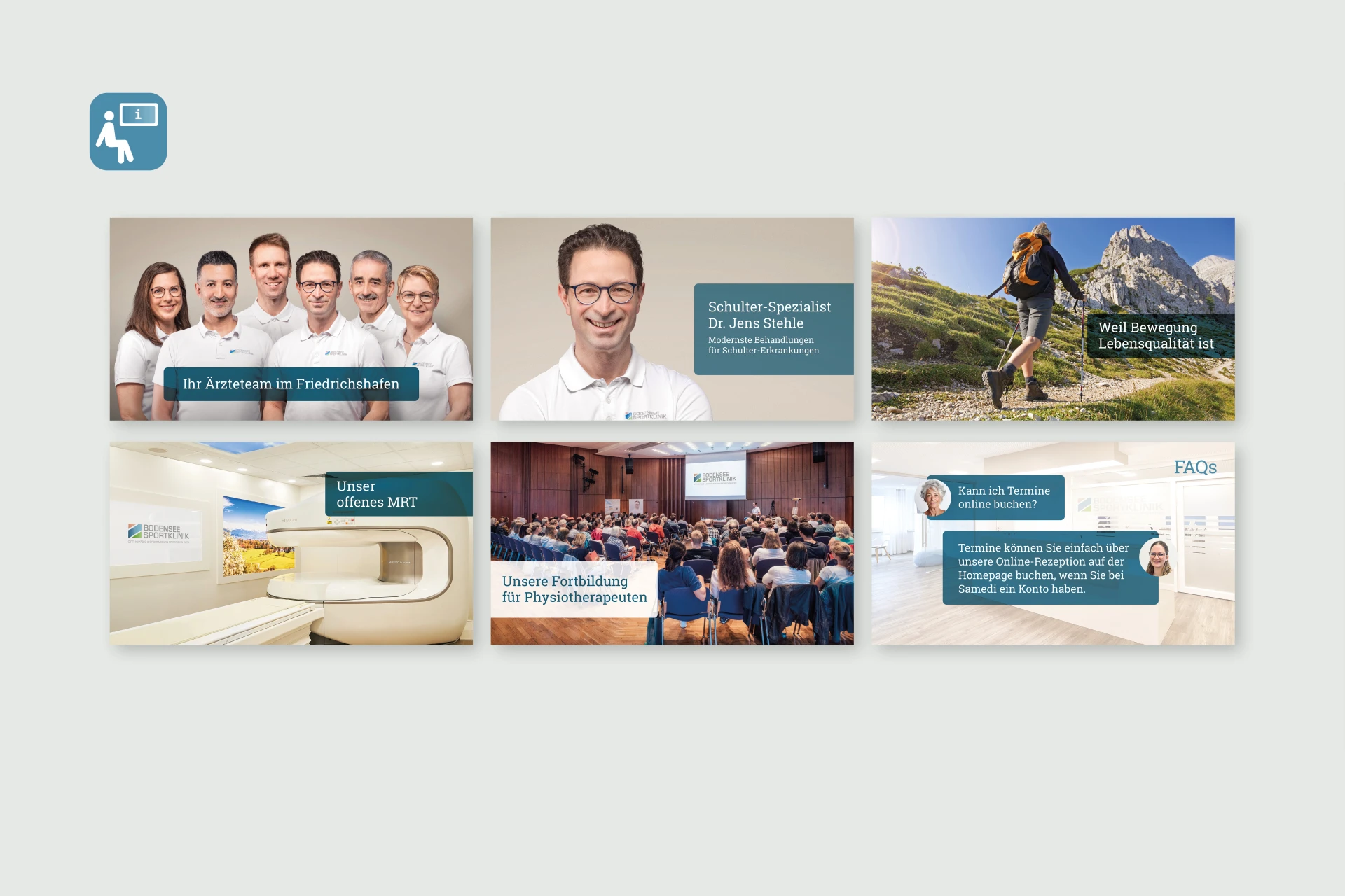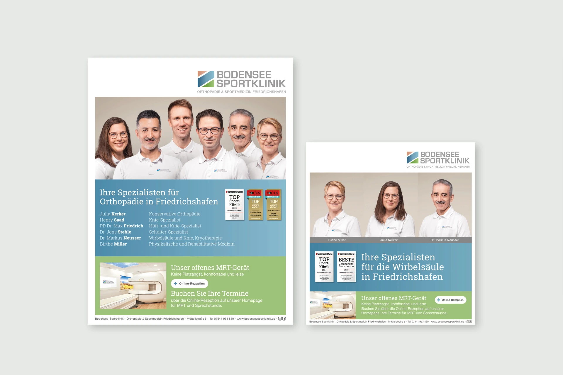 Im Jahr 2017 kam die Erweiterung. Zur Praxis kam eine Klinik mit zunächst zwei Operateuren hinzu. Eine Namensänderung war die Folge. Dazu wurde ein neues Logo entwickelt und daran abgeleitet ein komplett neues Corporate Design. Die heutige Bodensee-Sportklinik – Orthopädie und Sportmedizin Friedrichshafen entstand.